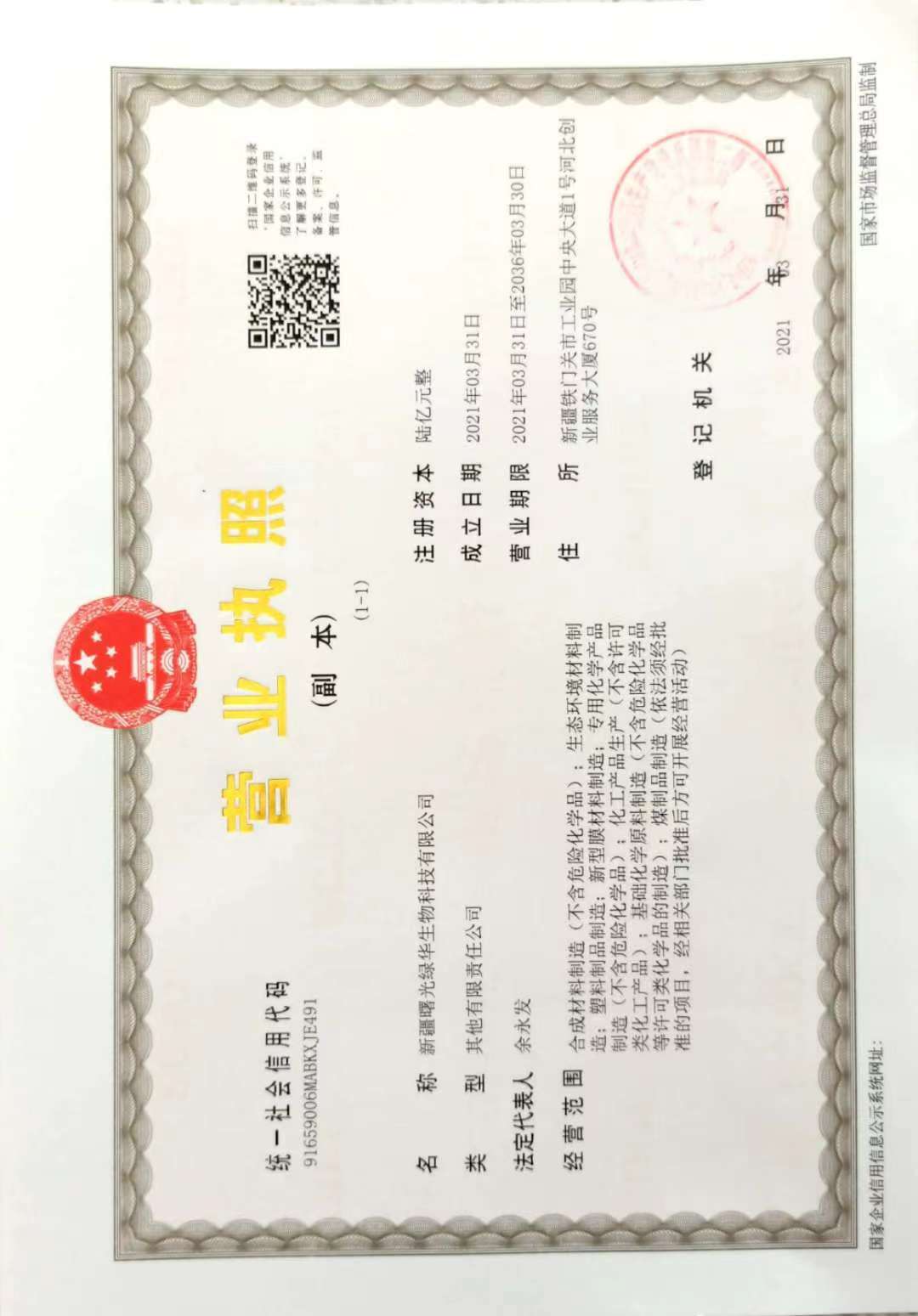 新疆曙光绿华生物科技有限公司由东华科技与安徽曙光化工集团股份有限公司、新疆绿原国有资本投资运营有限公司共同设立,注册资本金15亿元,其中东华科技持股5%。经营范围包括合成材料制造(不含危险化学品)、生态环境材料制造、塑料制品制造、新型膜材料制造、专用化学产品制造(不含危险化学品)、化工产品生产(不含许可类化工产品)、基础化学原料制造(不含危险化学品等许可类化学品的制造)、煤制品制造等业务。